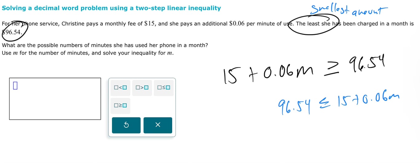 For his phone service, Manuel pays a monthly fee of $15, and he pays an additional $0.06 per minute of use. The least he has been charged in a month is $89.10.